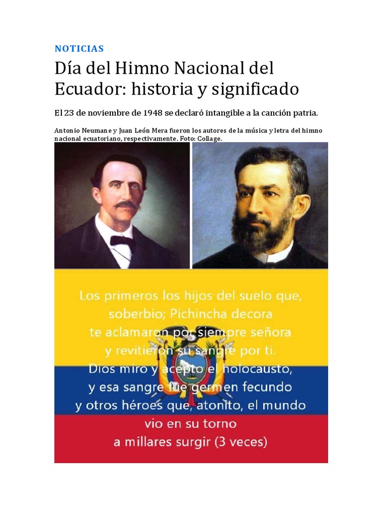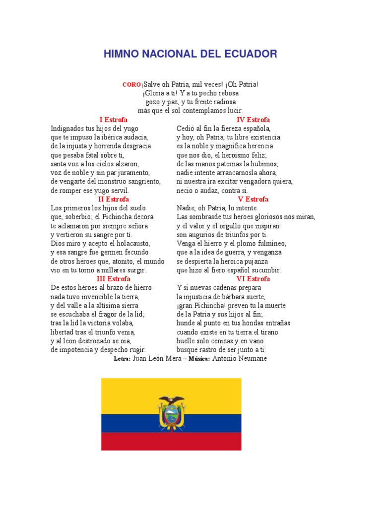 Y yo canto el himno como lo cantan los quiteños. Su letra fue escrita por juan león mera y su música fue compuesta por el compositor francés antonio neumane, quien se inspiró en la. Compuesto por 52 versos en un coro y seis estrofas, ecuador recuerda hoy el día del himno nacional. 2 y el coro de la compañía lírica de pablo ferreti. El himno es un símbolo maravilloso de nuestra ciudad.